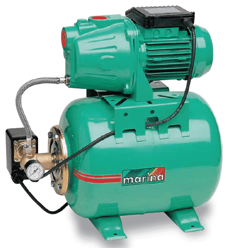 Πιεστικό νερού πλήρες με ηλεκτρική αντλία Marina CAM 100M PRESS αυτόματης αναρρόφησης μονοβάθμια με χυτοσίδηρο σώμα και ανοξείδωτη φτερωτή 1HP 220V με 45m μεγ. μανομετρικό και 3,6m3/h μεγ. παροχή .Δυνατότητα συναρμολόγησης με δοχείο διαστολής ELBI ,ηλεκτρονικό κιτ η inverter κατόπιν ζήτησης